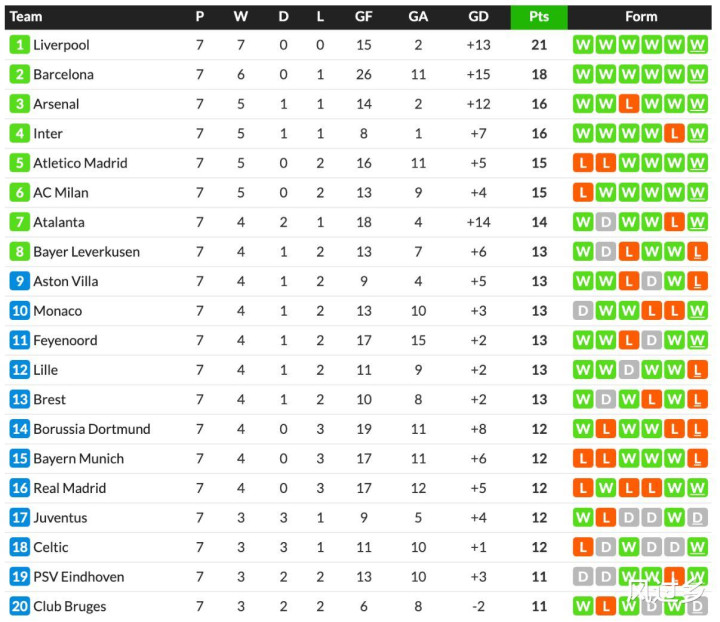 7轮比赛结束后,利物浦和巴萨分别位居1-2名,他们已提前出线。另外,第28名-第36名的博洛尼亚、莱比锡、赫罗纳等9支球队则已经提前出局。最后一轮比赛,这11支球队只是象征性地参赛,不用拼刺刀。